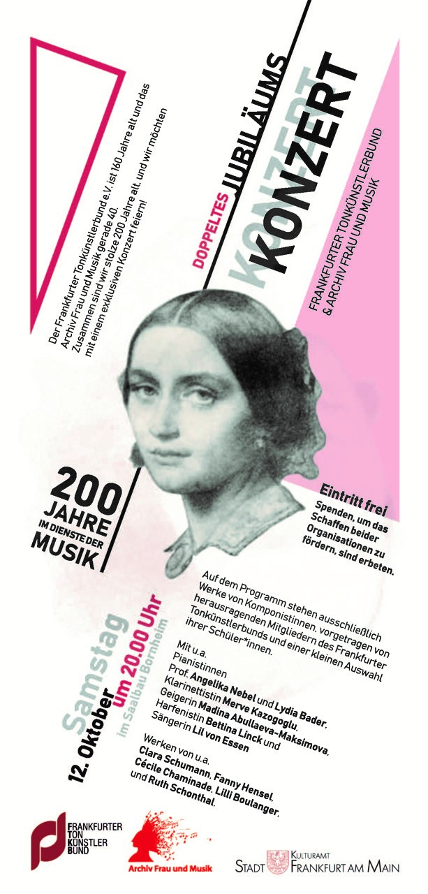 Mitglieder des Frankfurter Tonkünstlerbunds (FTKB) spielen in einem gemeinsamen Jubiläumskonzert zum 160. Jubiläum des FTKBs und dem 40. Jubiläum des Archivs Frau und Musik Werke von Komponistinnen aus verschiedenen Epochen mit anschließendem Empfang